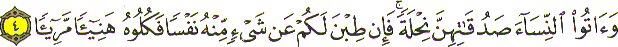 And give the women (on marriage) their dower as a free gift; but if they of their own good pleasure remit any part of it to you take it and enjoy it with right good cheer. (Sura 4. An-Nisaa Ayat 4)