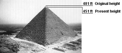 Adding together the lengths of all four sides gives a total of 921.453 meters 3023.14ft. It so happens that one degree latitude at the equator covers 110,573 m 362,679 ft., making each minute of arc 1842.88 m 6045 ft. This is almost exactly twice the perimeter of the great pyramid (921.453 X 2 = 1842.906 m). So the sum of the 4 sides is equal to half a minute of equatorial latitude. The error is only 13mm. With such accuracy, the implication must be that this relationship was deliberate or pure accident because tunnels are to be found lined up with the Orion consolation and as it happens to be, the consolation is located on the celestial equator. What Fir'uan did find was, not Musa's God but the Earth is round and he didn't even know about the discovery. The pyramid would have risen to the height of 480.94ft (146.59 m) when completed. Its upper courses are now missing, so it is now 451 ft (137.5 m) nearly 9.5 m 31 ft shorter. [4]