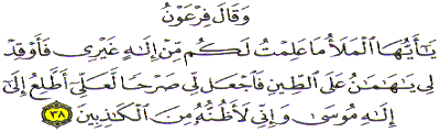 "Fir'uan (Pharaoh) said: "O chiefs! I know not that you have an Allah other then me. So kindle for me (a fire), 'O' Haman, to bake (bricks out of) clay, and set up for me a Srhan (a lofty tower or a palace) in order that I may (climb) look at (or look for) the Allah of Moses; and verily, I think that he (Moses) is one of the liars." (Sura 28. Al-Qasas Section 4 Ayat 38) In this verse, Fir'uan